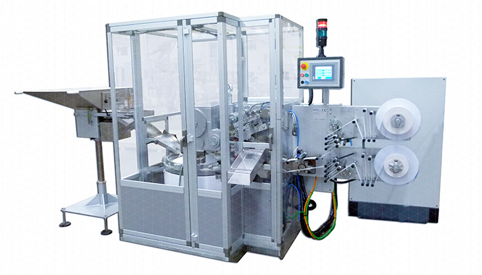 Wickelmaschine für Bonbons und Toffees in Doppeldreh-Einschlag, für eine Leistung bis 750 Stück/min mit Zuführteller.